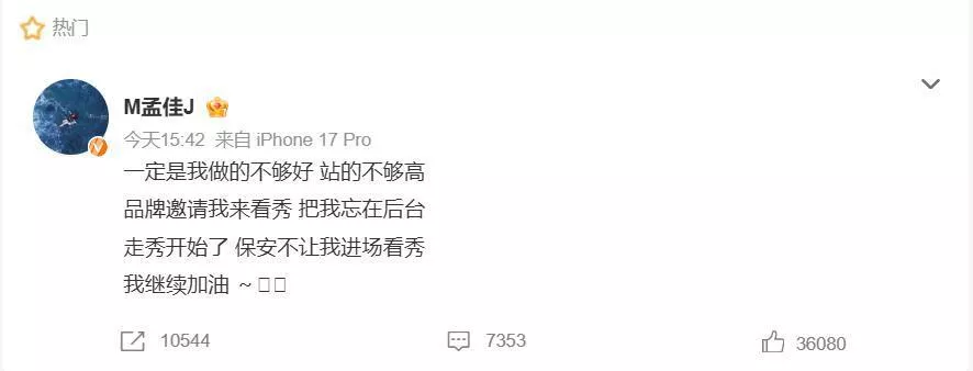 孟佳发文:一定是我做的不够好,站的不够高,品牌邀请我来看秀,把我忘在后台,走秀开始了 ,保安不让我进场看秀,我继续加油