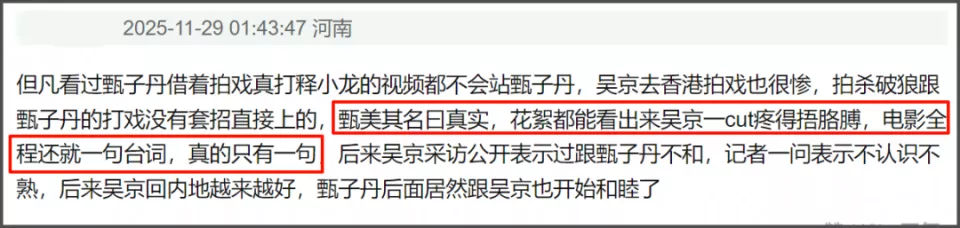 更有網友因此回憶起當年他是「劇組一霸」,一般打戲都是套招,甄子丹拍攝就要真打。當年港媒還報道甄子丹和吳京拍《殺破狼》打戲,4天打斷四根道具甩棍,毫不手軟,有網友稱從花絮能看出來,甄子丹下手不輕,吳京每次拍完都疼得捂胳膊,但吳京最後戲份還被刪到就剩一句台詞。