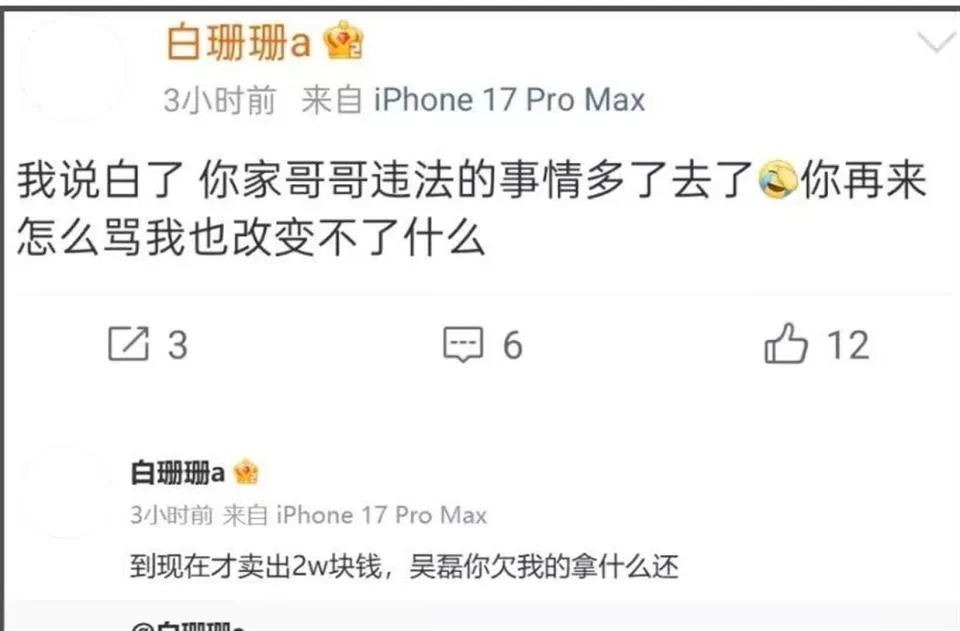 微博用户“白珊珊a”扔出一枚重磅炸弹:公开叫卖“吴磊床照”,标价1万元一张,并喊话“吴磊你欠我的拿什么还”。短短半小时内,她直接点名吴磊,声称已成交2万元,却未出示任何照片或聊天记录证据。这场看似普通的爆料因吴磊工作室的“68分钟闪电辟谣”迅速升级,声明中强调“所有言论均为恶意捏造”,并宣布已启动法律程序。