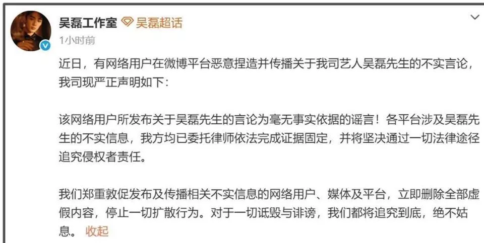 然而,吴磊工作室在20:45即发布声明,全程仅用68分钟。 声明措辞强硬,称已固定全平台证据,将追究侵权者法律责任。