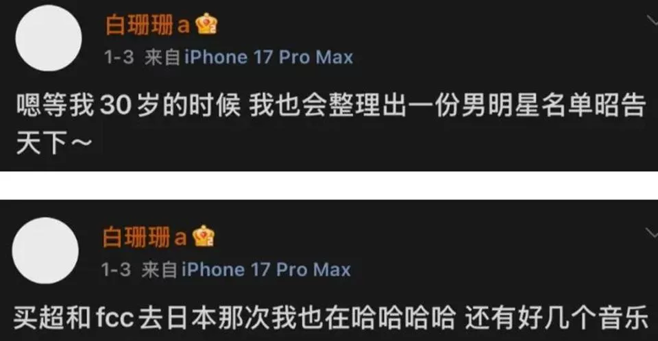 白珊珊的评论区同样混乱,她自称“比司晓迪年轻漂亮,睡的男明星更帅”,而司晓迪正是2025年因伪造明星聊天记录被封杀的网红。