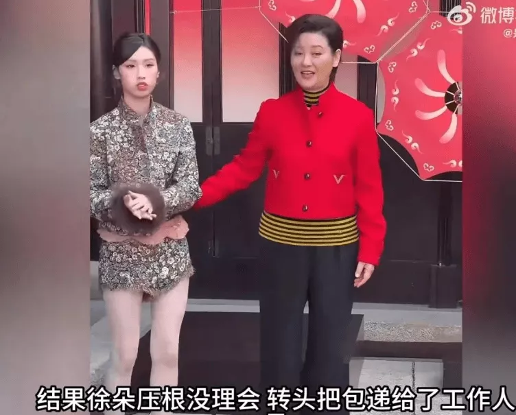 面对徐帆伸出的手,徐朵或是将双手背在身后刻意躲避,或是双手交握置于身前拒绝触碰,又或是转身给工作人员递包、背向徐帆,全程神情显得有些冷漠疏离,视线也始终避开养母,刻意拉开距离。徐帆几次落空的手,配上脸上难掩的尴尬,让这短短几秒的互动充满了张力。