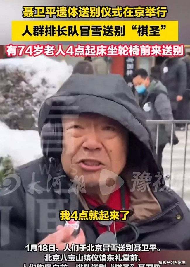 上至74岁,腿脚不便扛着大雪前来悼念,下至13岁,一直以聂卫平为榜样的学生,含泪送花道别。