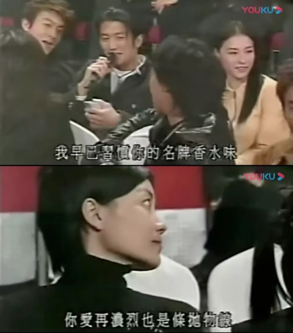 2001年TVB颁奖礼,谢霆锋唱着歌走下舞台坐到张柏芝和陈冠希之间跟他们欢乐互动,坐在前排的王菲两度回头看,第二次她头转一半又忍住,短短几秒钟就能看出王菲的伤感。
