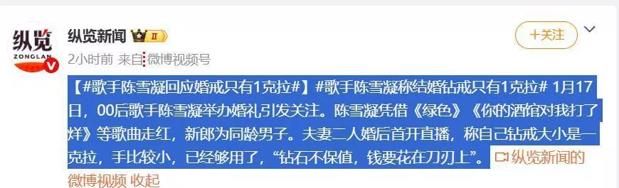 歌手陈雪凝回应婚戒只有1克拉!钻石不保值,钱要花在刀刃上