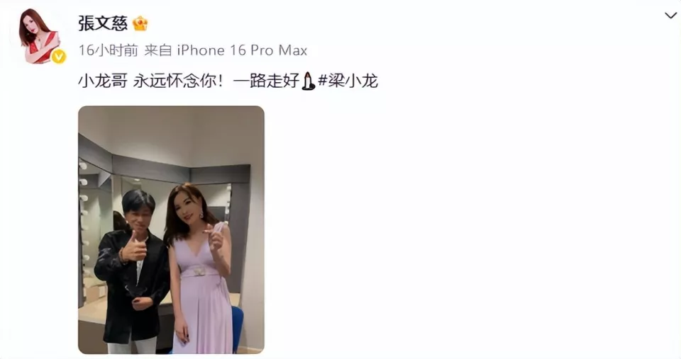 香港演员张文慈,则是晒出她与梁小龙的合照,配文,“小龙哥,永远怀念你,一路走好!”。