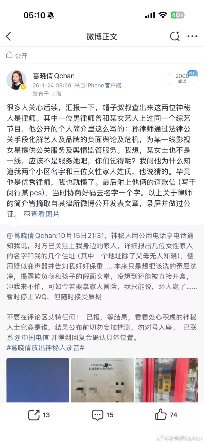 葛晓倩报警立案后,时隔一年多终于曝出进展。她直言涉事人员中有一名男律师,此人不仅曾和某女艺人同台综艺,简介里说“曾为某一线影视女星提供公关服务及舆情监管服务”。