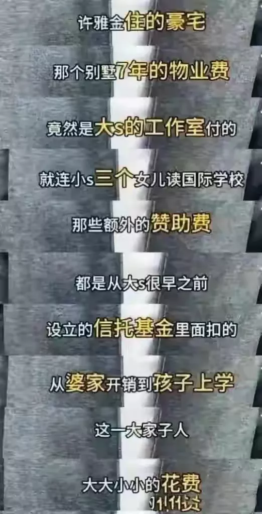 他们三个女儿国际学校的费用,以及许雅钧豪宅的物业费,都是大S工作室支付的。她自然清楚,自己原生家庭照顾不好两个孩子。
