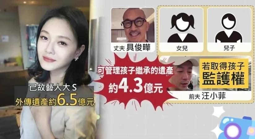 此前,大S保守估计约6.5亿新台币的遗产,主要是由韩国老公具俊晔、大女儿小玥儿、小儿子小箖箖三个人平分。