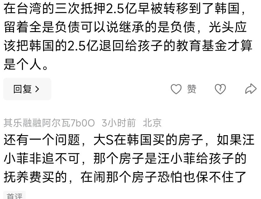 有的网友点评得特别难听,说具俊晔是没有钱交遗产税,也还不起欠银行的房贷和抵押款,他又怕汪小菲对大S生前所有财产的流向做彻查,这才想到这种表面上和气的“金蝉脱壳”之法。