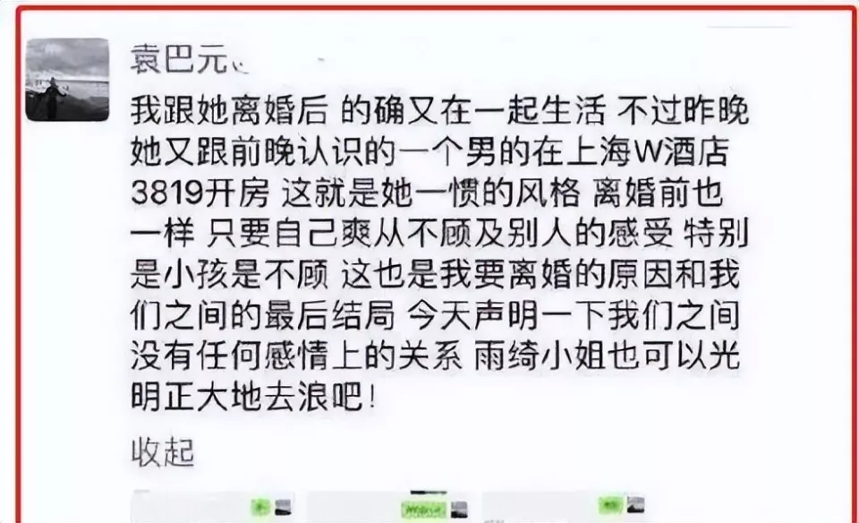 袁巴元多次爆料前妻婚内出轨、隐瞒财产,甚至还说张雨绮有狐臭;