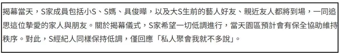 ——然而大S一双子女却没有机会,大S是他们的妈妈,妈妈的葬礼、纪念雕像、周年忌日都和他们无关。