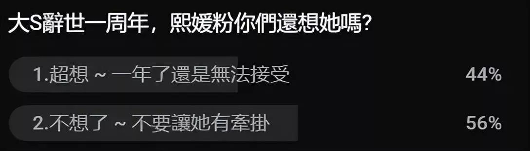 有网友在仪式直播弹幕区开设了投票,有一个选项表达了很大一部分人的心声,陌生人的悲伤感慨就算持续着,也是埋在心底,但S家不一样,他们只要公开表现一次,就会让自己和大S再次受到关注,一直以来,都是S家抓着大S不放。