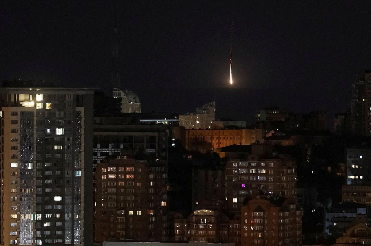俄罗斯无人机7月6日袭击基辅期间,能看见上空有一架无人机爆炸。(路透)