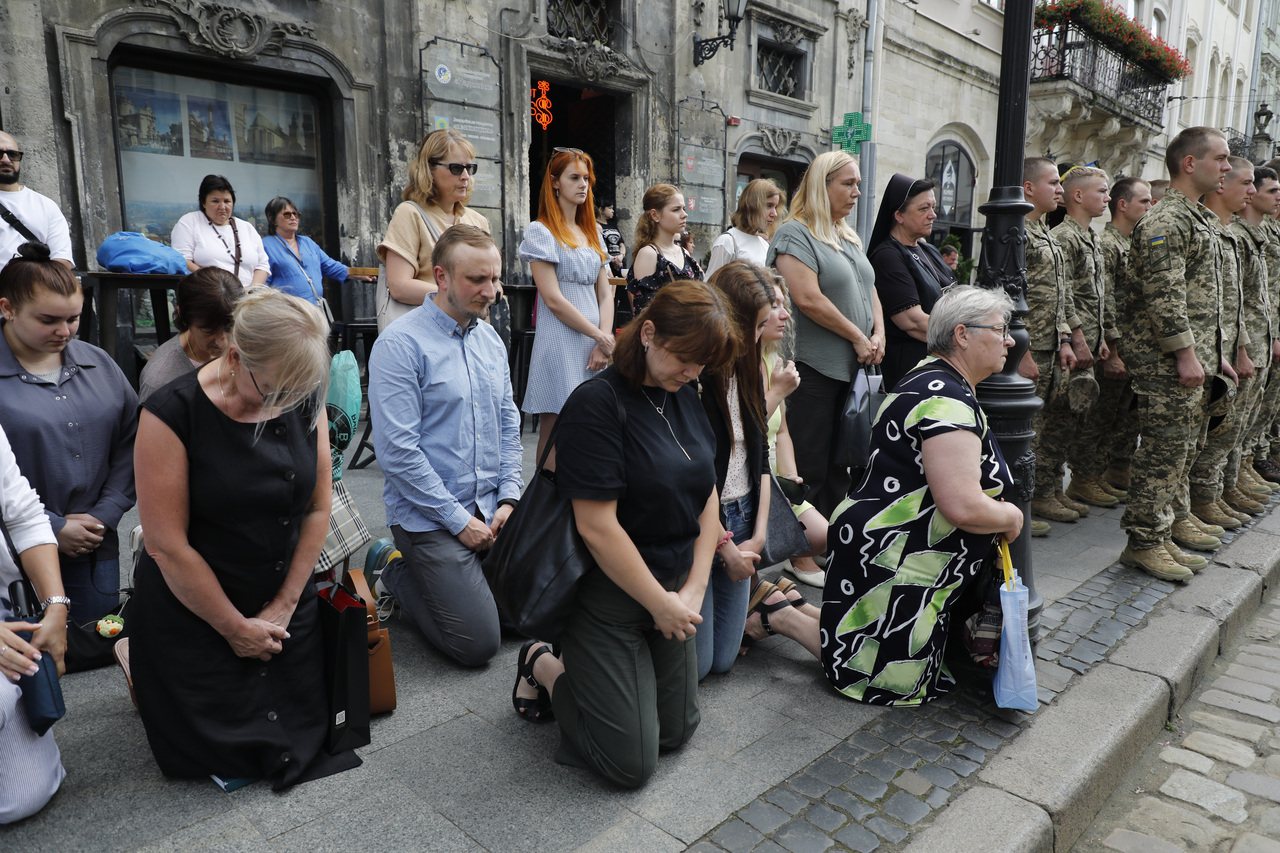 日前在乌克兰利沃夫市中心举行的葬礼上,民众下跪向在俄罗斯战俘营中牺牲的12名乌克兰士兵致敬。 (美联社)