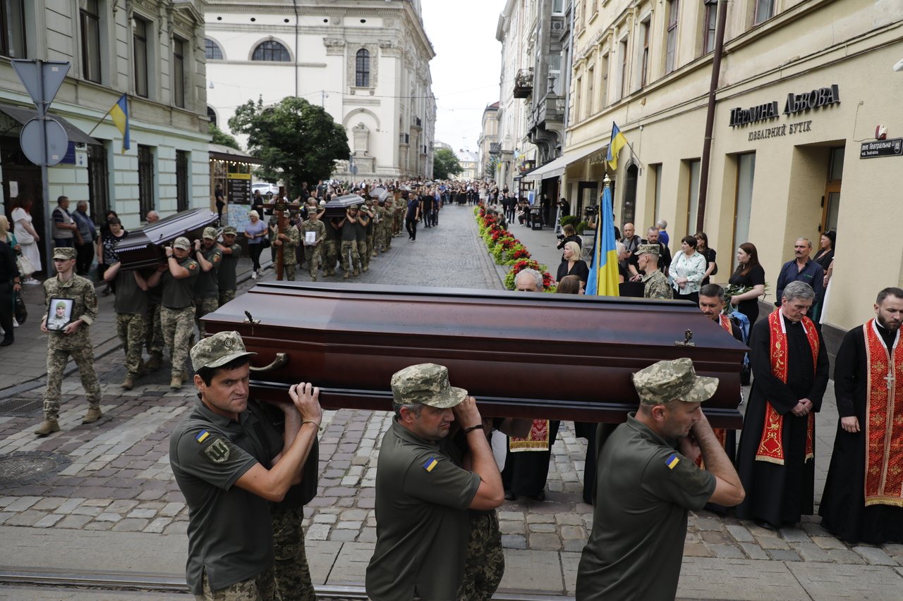 日前在乌克兰利沃夫市中心举行的葬礼上,士兵们抬著12名在俄罗斯战俘营中牺牲的乌克兰士兵棺材。 (美联社)