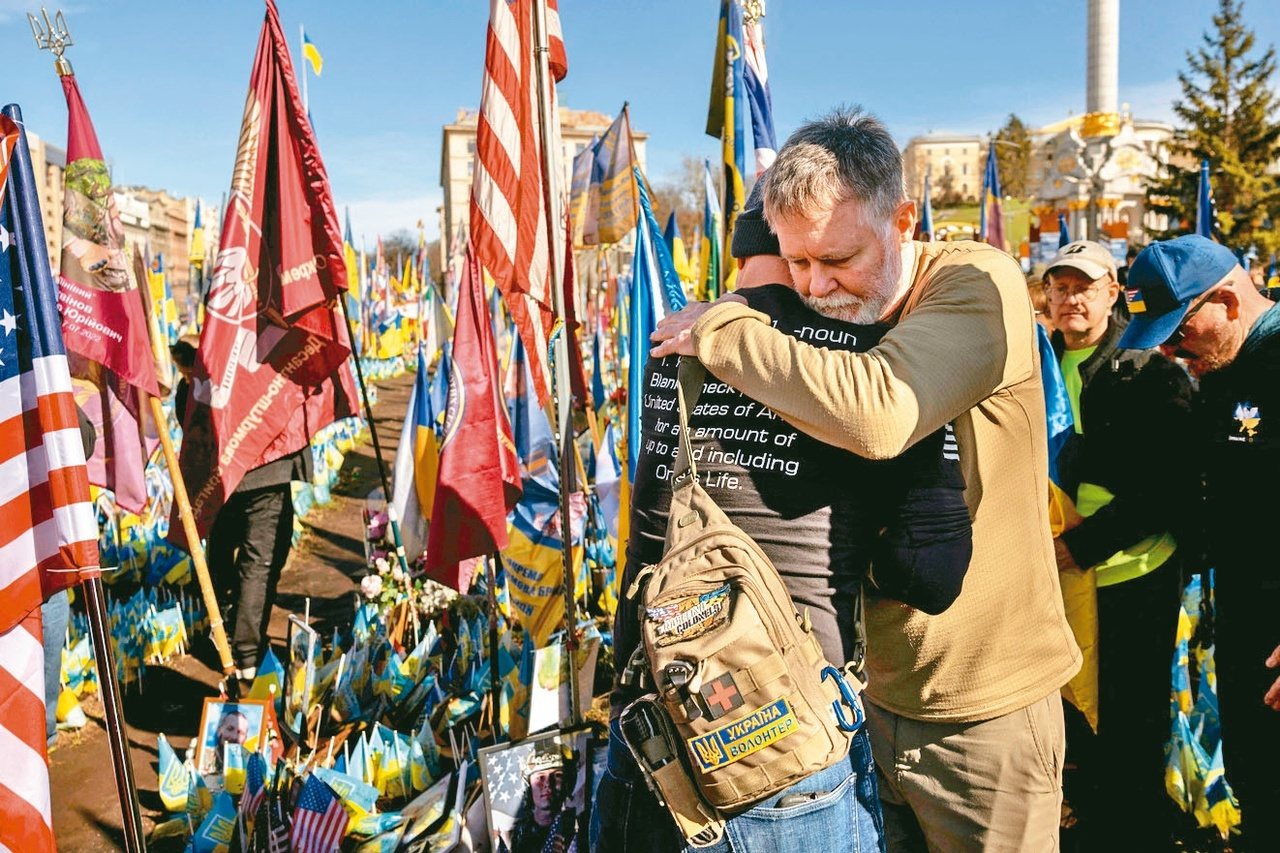 协助乌克兰作战的美国志愿军柯尔(前右)3月在基辅悼念阵亡同袍,并拥抱另名美国志愿军。纽时报导,乌克兰一处外籍志愿军训练营7月遭俄军飞弹袭击,遇袭新兵来自美国、哥伦比亚、台湾、丹麦等地。(路透)