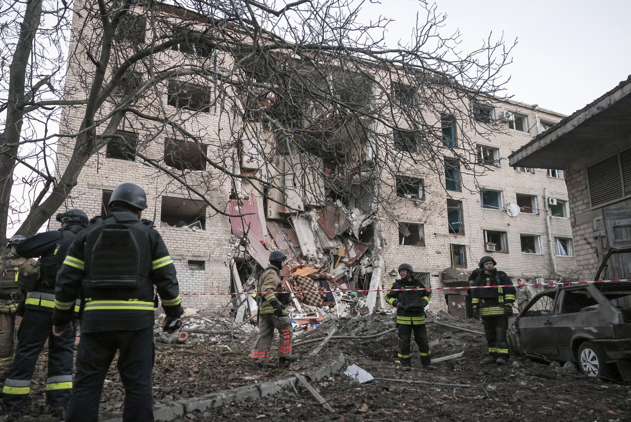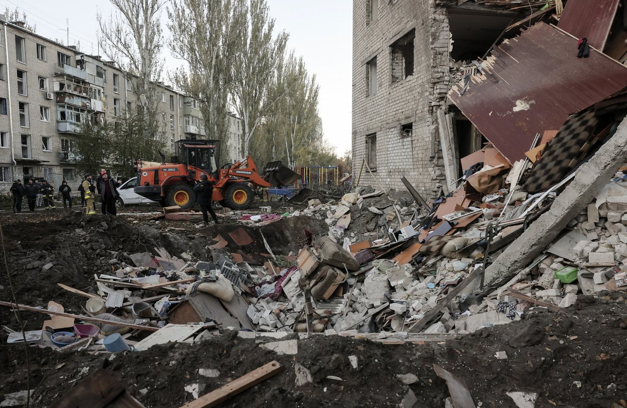 俄罗斯30日空袭乌克兰东南部札波罗热市(Zaporizhzhia)造成13人受伤。图为乌国救援人员在一处遭俄军袭击的住宅区前救援。欧新社