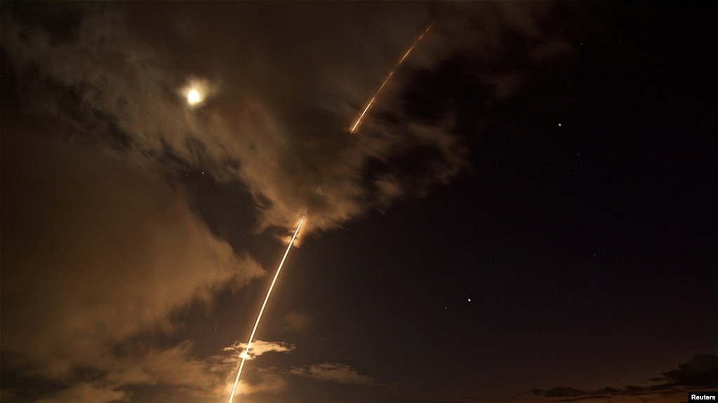 一枚中程弹道飞弹目标从太平洋飞弹靶场发射,随后被美国海军飞弹驱逐舰发射的标准6号飞弹成功拦截。(美国海军/路透社发布)