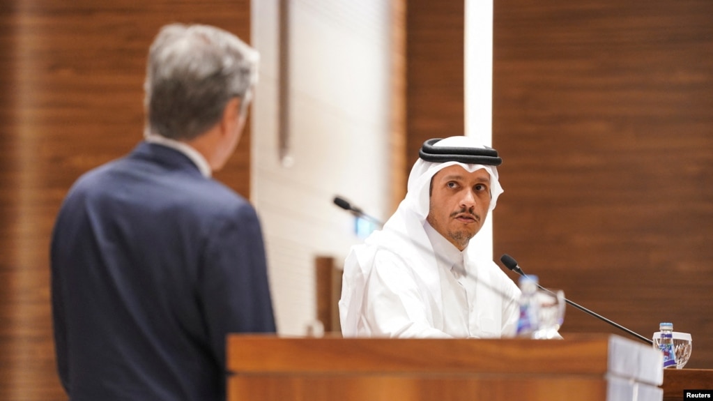 美国国务卿布林肯与卡塔尔首相兼外交部长穆罕默德·本·阿卜杜拉赫曼·阿勒萨尼在多哈出席新闻发布会。(2024年10月24日)